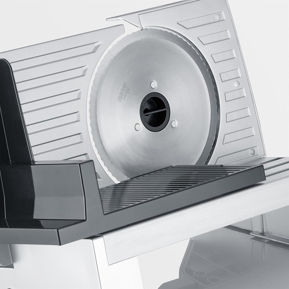 Skivetykkelsen kan justeres trinløst fra 0 til 23 mm, så du nemt kan tilpasse skiverne efter behov. Lav helt tynde skiver til sandwiches eller kraftigere skiver til servering. Det runde skæreblad fra RSG Solingen sikrer præcise snit og holder skarpheden længe.