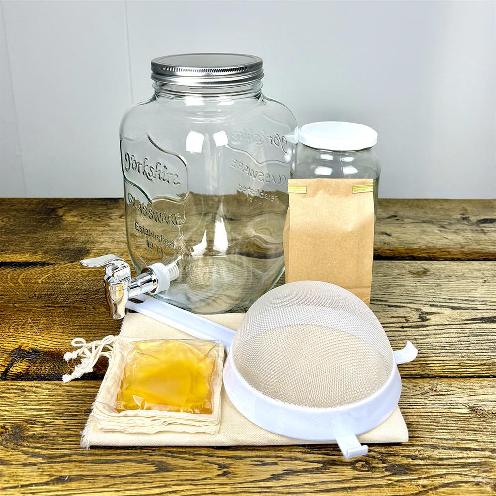Med dette kombucha begyndersæt får du alt det vigtigste udstyr til at brygge din egen kombucha derhjemme. Sættet gør det nemt at komme i gang – også for begyndere – og giver dig mulighed for at brygge op til ca. 3 liter færdig kombucha pr. batch.