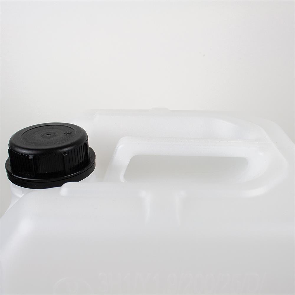 Dunken er designet med flad top og bund, så den nemt kan stables under transport eller opbevaring. Den sorte prop sikrer tæt lukning, og åbningen gør det nemt at fylde, tømme og rengøre dunken.