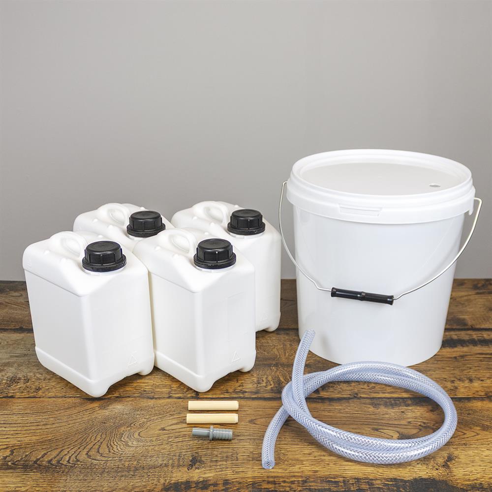 - 1 stk tappespand med hank og låg, 10 liter, hvid. Låget er forboret med hul til tappeslangen.