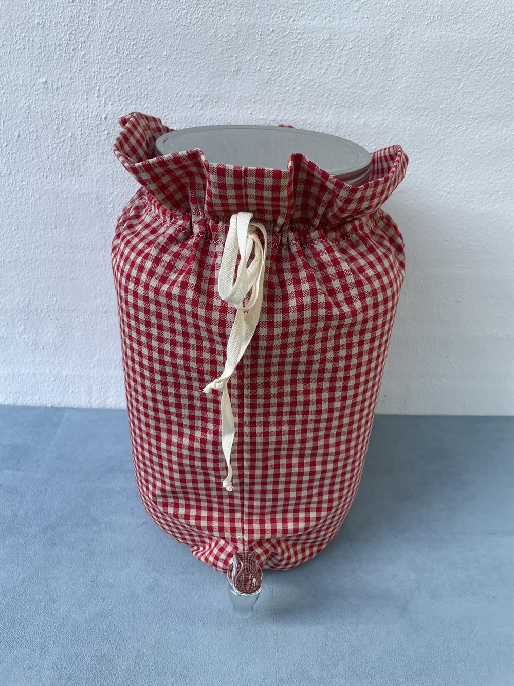 Vineddikekrukke af glas med tappehane, rødternet stof, 8 liter