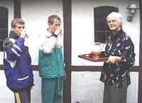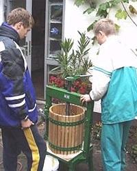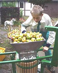 i møllen. Møllens håndtag drejes, hvorved æbler/pærer